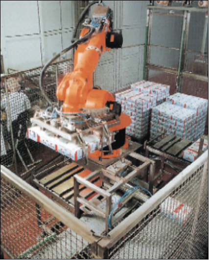 機(jī)器人碼垛系統(tǒng)包括工業(yè)機(jī)器人、控制器、編程器、機(jī)器人手爪、自動拆/疊盤機(jī)、托盤輸送及定位設(shè)備和碼垛模式軟件。