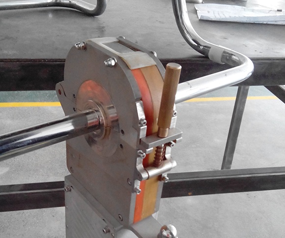 管管對接工裝由夾緊裝置,氣動升降裝置,彈性自適應裝置,橫向調整裝置,以及啟動控制系統五部分組成。適用夾緊管徑范圍16-36mm之間。工作時,由工人雙手持續要焊接的不銹鋼管在夾緊工裝的V型塊上對接,然后壓緊工件。氣動升降氣缸升起焊接機頭,使機頭副鉗口的定位圓與管子貼合定位,由工人通過彈簧自適應裝置調整機頭上鎢極位置,使之與管管對接縫處正對,然后壓緊機頭上壓緊蓋,啟動焊接。焊接完成后,打開機頭,機頭下降,松開夾具,送出工件。