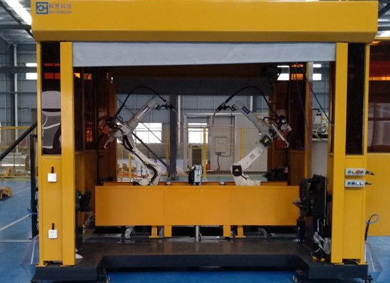 柔性自動(dòng)化焊接系統(tǒng)采用雙工位雙機(jī)器人,實(shí)現(xiàn)焊接全自動(dòng)化。機(jī)器人利用效率高,工人勞動(dòng)強(qiáng)度低,焊接品質(zhì)好,產(chǎn)品的不良率低,其整體生產(chǎn)效率是人工的4-5倍。