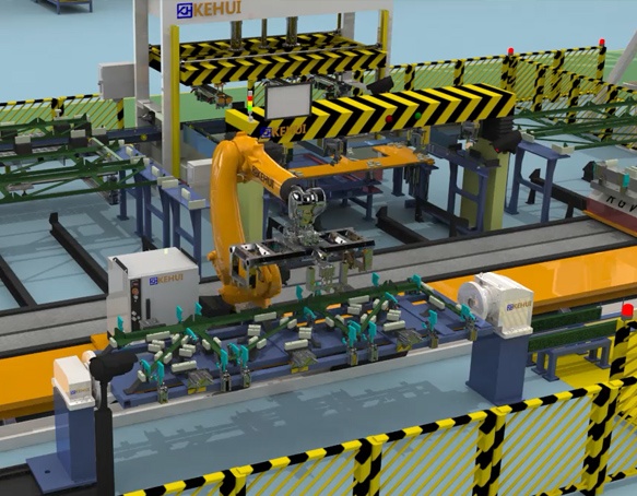 整條智能化柔性生產線從左向右呈“一”字型布置的柔性焊接生產線,共劃分為包含生產工位和存放區域在內的15個工位區,能夠滿足多種系列工件的共線生產。生產線采用焊接機器人、裝配機器人、RGV、自動換槍裝置、自動檢驗校對平臺、伺服翻轉變位機、物料快裝定位小車、柔性工裝、回火爐等,通過信息化生產指揮調度系統統一調試生產,實現裝配焊接工位標準化、作業過程程序化、部件裝卸運輸自動化、生產管理信息化。